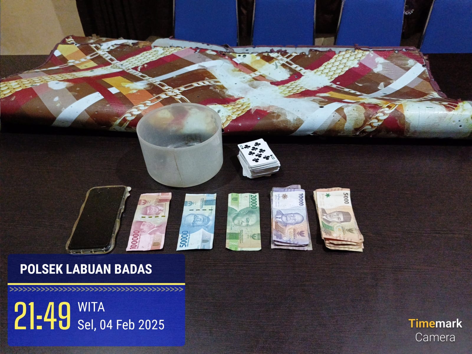 Dari para pelaku, tim gabungan berhasil mengamankan barang bukti berupa 1 Lembar pecahan uang Rp. 100.000, 1 Lembar pecahan uang Rp. 50.000, 1 Lembar pecahan uang Rp. 20.000, 6 Lembar pechan uang Rp. 10.000, 14 Lembar pecahan uang Rp.5000, 2 Set Remi, 1 Buah HP android jenis Vivo, 1 Lembar tikar karet bermotif dan 1 Buah Toples Plastik.