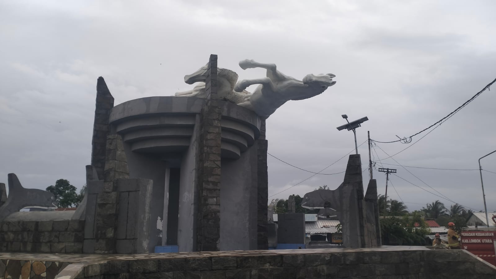Patung kuda yang menjadi ikon Kecamatan Kayangan tersebut tak kuasa menahan kencangnya angin yang menerpa Kecamatan Kayangan sehingga merubuhkan patung ikonik tersebut.