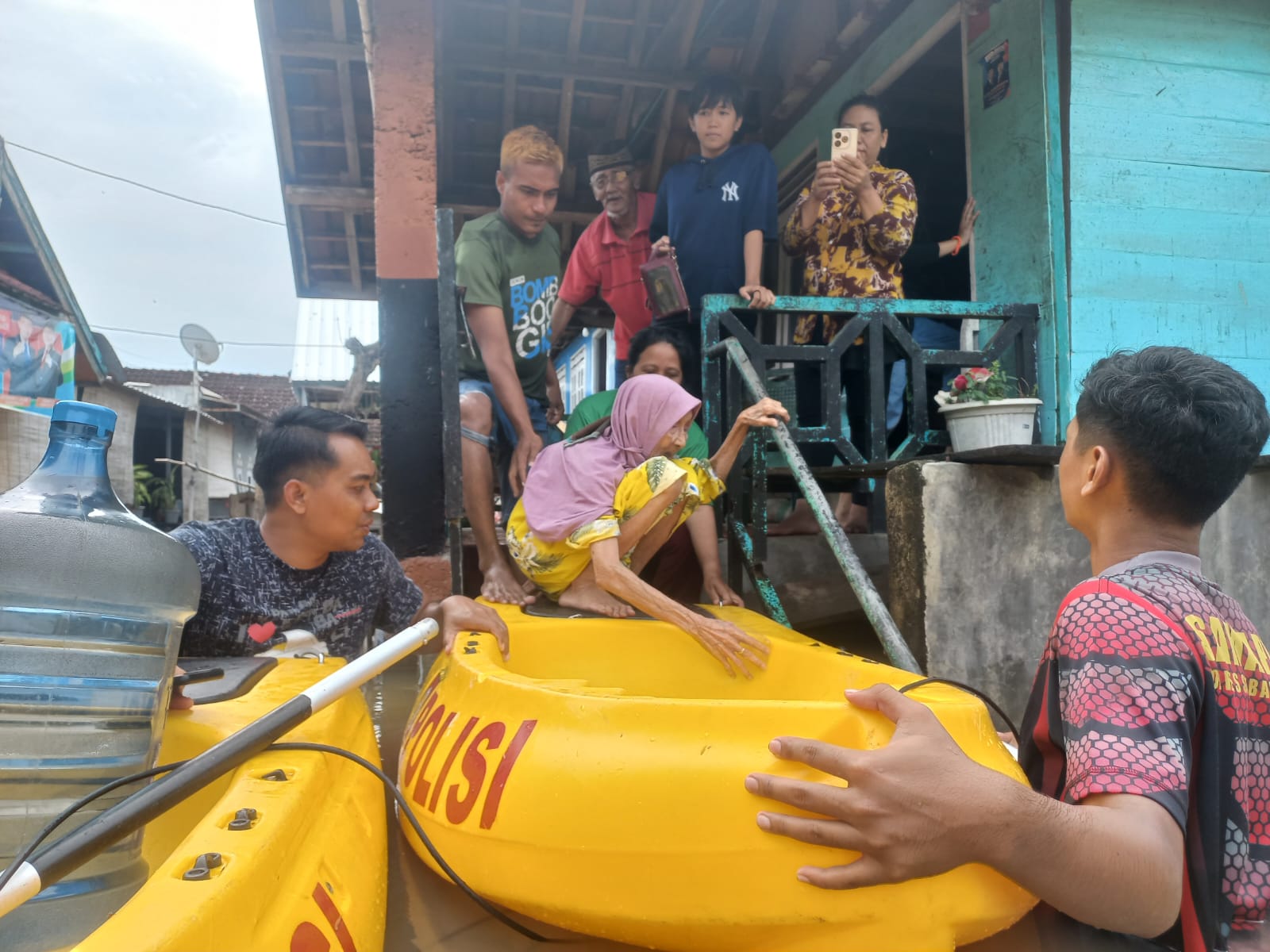 Dua orang warga berhasil dievakuasi tim tanggap bencana Polres Sumbawa Barat dengan menggunakan kano menuju rumah keluarganya yang lebih aman.