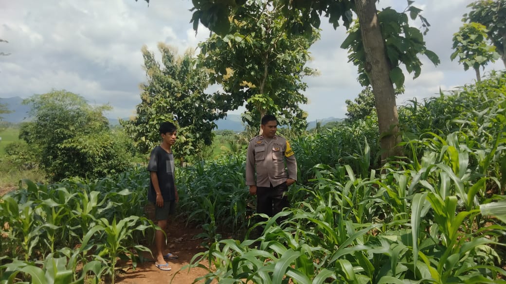 Bhabinkamtibmas (BKTM) Desa Mbawi Aipda Muztahidin melaksanakan pemantauan dan pengecekan lahan jagung milik Bapak Sirajudin di Dusun Owo, Desa Mbawi, Kecamatan Dompu dalam rangka mendukung Program Ketahanan Pangan Nasional Menuju Indonesia Emas 2045.