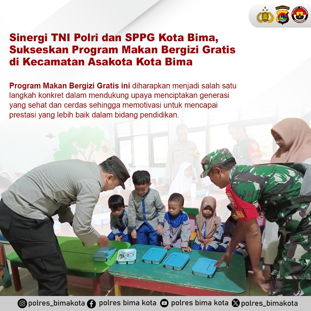 Kota Bima, NTB (23 FFebruari 2025) – Dalam rangka mendukung program pemerintah untuk menciptakan generasi penerus bangsa yang sehat dan cerdas, Bhabinkamtibmas Polsek Asakota bersama Babinsa turut mendampingi dan mengamankan kegiatan pemberian Makan Bergizi Gratis (MBG) oleh Satuan Pelayanan Pemenuhan Gizi (SPPG) Kota Bima bagi peserta didik di wilayah Kecamatan Asakota, Kota Bima, pada Sabtu, 22 Februari 2025.
