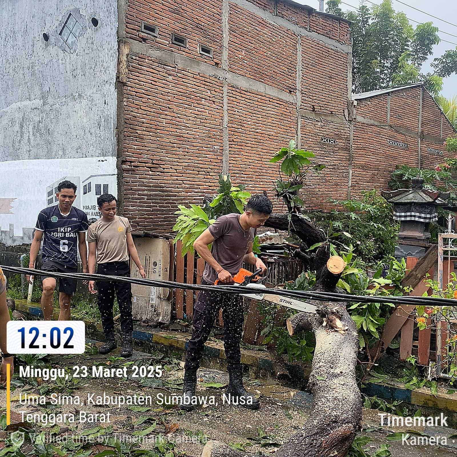 Sumbawa Besar-NTB, Personel Sat Samapta Polres Sumbawa menunjukkan respon cepat dalam menangani pohon tumbang yang terjadi di wilayah Kebayan, Kelurahan Uma Sima, Sumbawa, pada Minggu (23/03/2025) sekitar pukul 11.25 WITA. Kejadian tersebut menyebabkan pagar rumah warga tertimpa dan kabel listrik ikut tertarik.