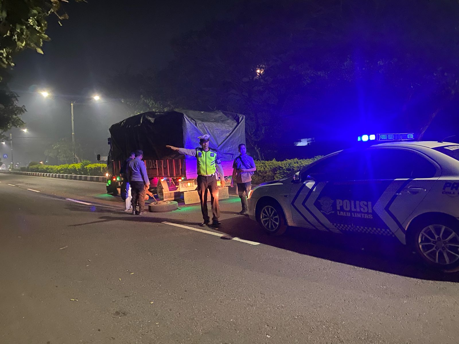 Pada saat patroli berlangsung, petugas mendapati seorang pengendara truk yang mengalami pecah ban di salah satu ruas jalan yang mereka lalui.