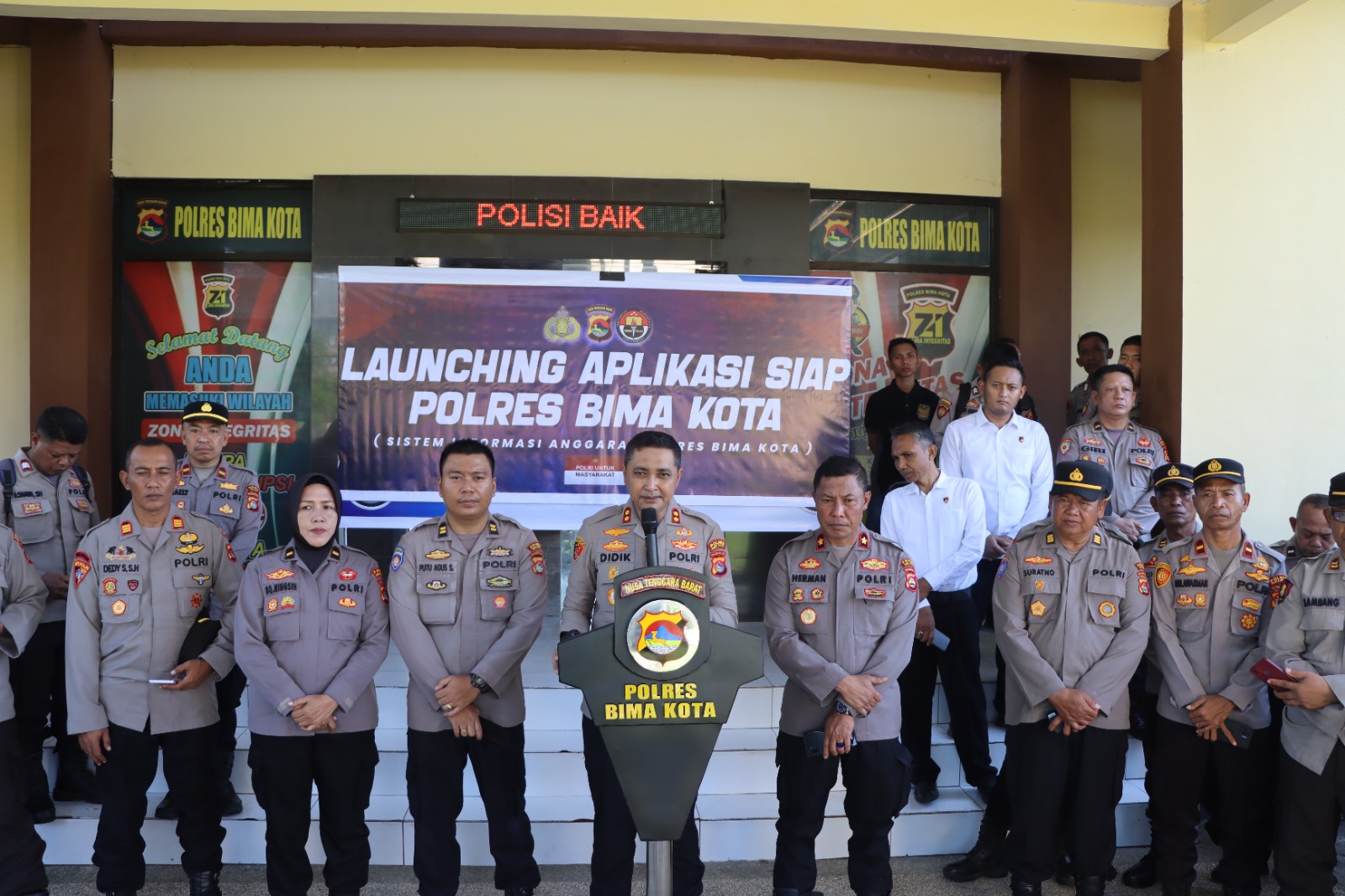Peluncuran aplikasi berlangsung di halaman Mako Polres Bima Kota dan dipimpin langsung oleh Kapolres Bima Kota, AKBP Didik Putra Kuncoro, S.I.K., M.Si., serta dihadiri para pejabat utama dan puluhan personel dari berbagai satuan.