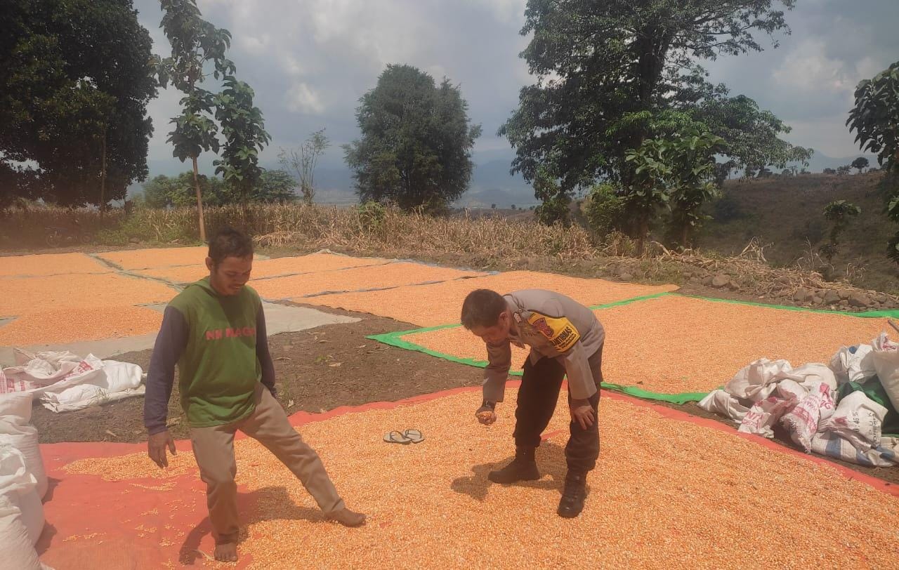 Bripka Abdul Karim Bhabinkamtibmas Polsek Donggo Polres Bima Polda NTB memantau dan membantu proses pengeringan jagung milik warga di Desa Binaannya Selasa (22/4/25) siang kemarin.