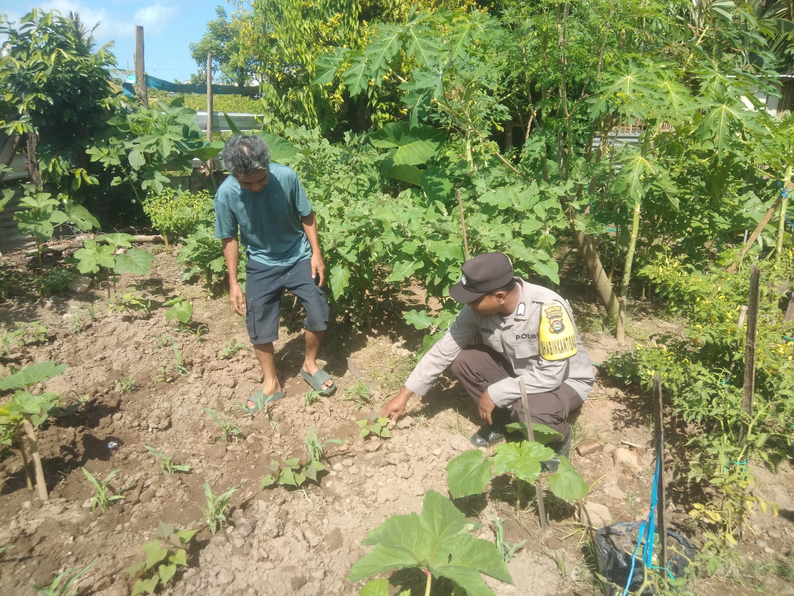 Bhabinkamtibmas Desa Bukit Damai hadir langsung mendampingi warga dalam melihat perkembangan tanaman, memberikan edukasi tentang pola tanam yang tepat, serta mendorong warga untuk lebih aktif memanfaatkan lahan kosong di sekitar rumah.