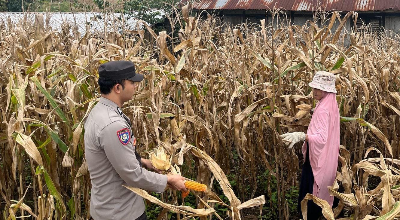 Terlihat Bhabinkamtibmas berseragam lengkap ikut membantu proses pemanenan jagung milik Warga Binaannya.Kegiatan tersebut merupakan salah satu kontribusi Kepolisian Resor Bima dalam mewujudkan Indonesia yang Swasembada Pangan.