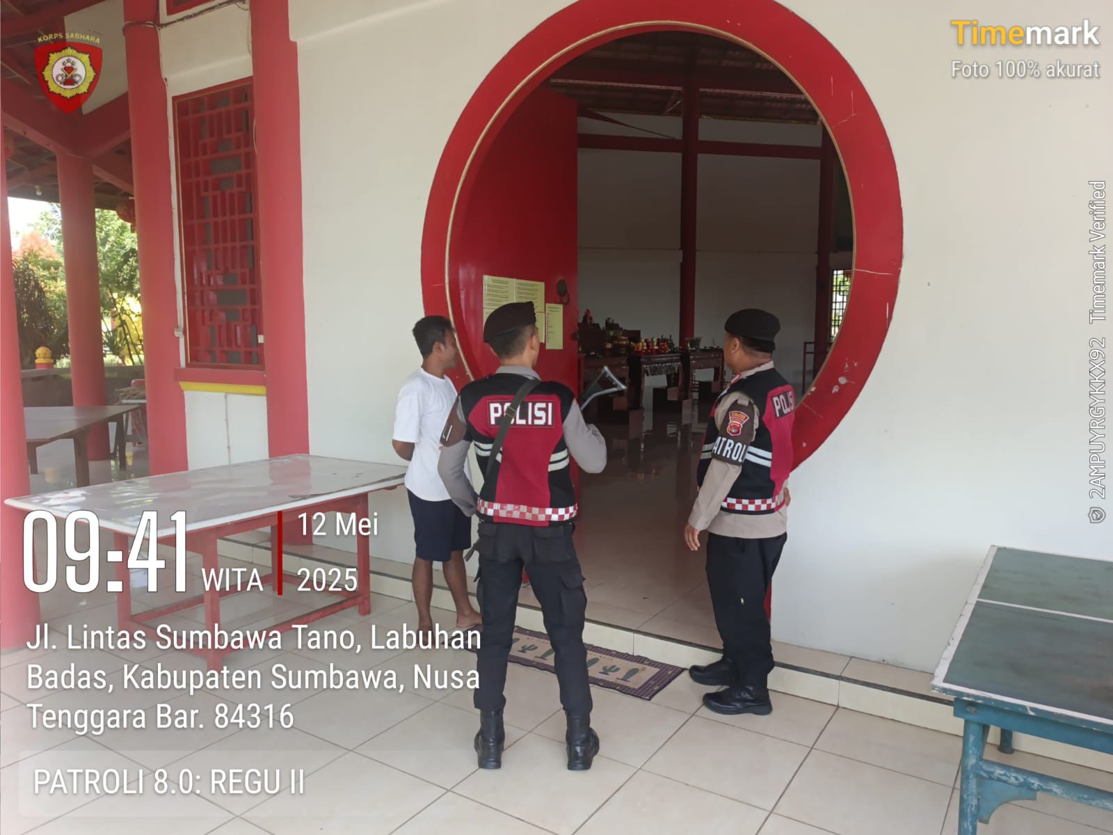 Sumbawa Besar–NTB, Jajaran Satuan Samapta Polres Sumbawa melaksanakan patroli Kegiatan Rutin Yang Ditingkatkan (KRYD) pada Senin (12/05/2025) pukul 08.00 Wita hingga selesai di Klenteng Bao An Gong, Labuhan Badas, Kecamatan Labuhan Badas, Kabupaten Sumbawa. Kegiatan ini bertujuan untuk memberikan pengamanan dan pengaturan selama perayaan Hari Raya Waisak 2569 Tahun 2025 bagi umat Buddha di wilayah Kabupaten Sumbawa.