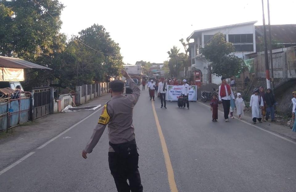 Bhabinkamtibmas Polsek Donggo Laksanakan Pengamanan Pawai Ta’aruf Pembukaan MTQ Tingkat Desa Rora