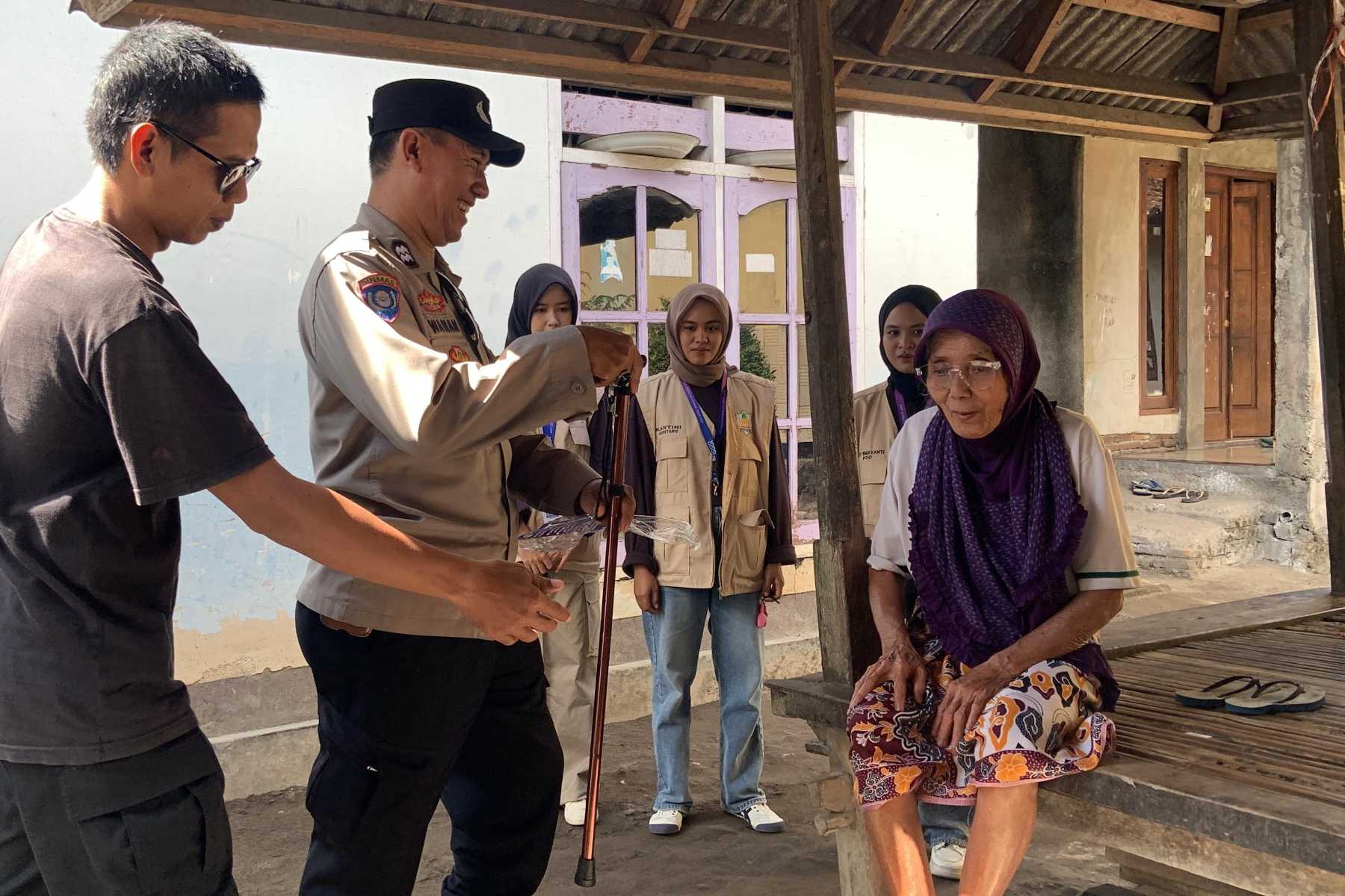 Kunjungan pertama dilakukan ke rumah seorang lansia berusia 63 tahun yang tinggal di RT 03 Dusun Jakem. Polisi menyerahkan tongkat alat bantu jalan secara langsung, yang disambut dengan senyum dan ucapan terima kasih yang tulus dari Lalu Mawe.